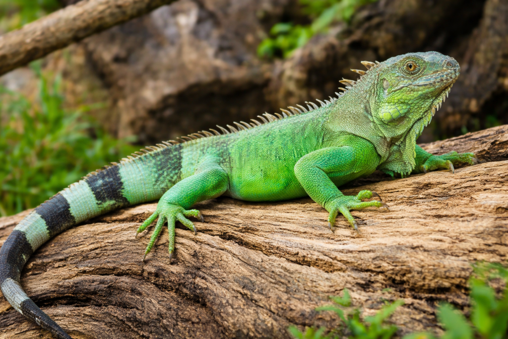 Green iguanas are large lizards that can grow up to 4–6 feet long, including their tail. Despite their name, they can appear in shades of green, gray, or even orange during breeding season.